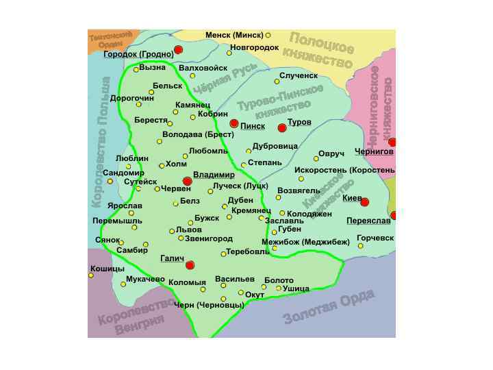 Галицко-Волынское княжество • Территория Галицко-Волынской земли простиралась от Карпат до Полесья, захватывая течения рек Днестра, Прута, Западного и Южного Буга, Припяти. • Природные условия княжества благоприятствовали развитию земледелия в речных долинах, в предгорьях Карпат — добыче соли и горному делу. • Важное место в жизни края играла торговля с другими странами, большое значение в которой имели города Галич, Перемышль, Владимир-Волынский. • Активную роль в жизни княжества играло сильное местное боярство, в постоянной борьбе с которым княжеская власть пыталась установить контроль над положением дел в своих землях. • Постоянное воздействие на процессы, происходившие в Галицко-Волынской земле, оказывала политика соседних государств Польши и Венгрии, куда за помощью или с целью найти убежище обращались как князья, так и представители боярских группировок.