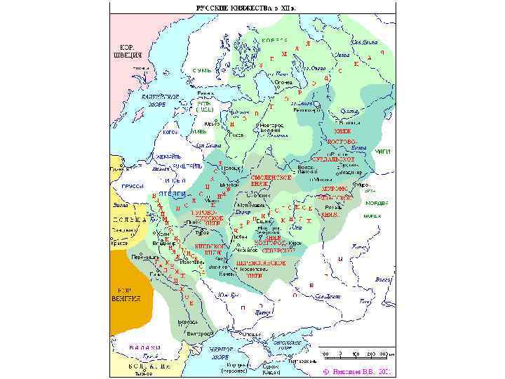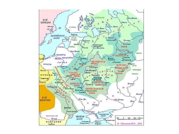Ø Киев стал первым среди равных княжеств-государств. Вскоре другие земли догнали и даже опередили его в своем развитии. Сложились, таким образом, полтора десятка самостоятельных княжеств и земель, границы которых сформировались в рамках Киевской державы как рубежи уделов, волостей, где правили местные династии. Титулом великого князя величали теперь не только киевских, но и князей других русских земель. Ø Однако Русская земля не была надежно защищена от сильного вмешательства извне. Ø Кроме того постоянные княжеские усобицы подрывали развитие отдельных княжеств и ослабляли их обороноспособность. Ø Если русские княжества более или менее успешно противостояли половецким кочевникам на Юге и крестоносцам на Западе, то они совершенно оказались не готовы дать отпор хлынувшим с востока в XIII в. войскам Чингисхана и его наследников.
