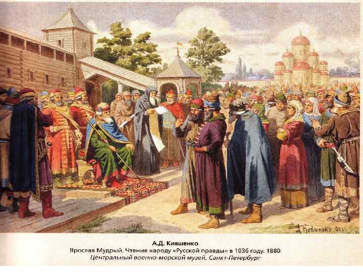Ярослав Мудрый (978 -1054 гг. ) Являясь четвертым сыном Владимира I, сумел стать великим князем и править почти 35 лет. Смелый воин, полководец. Ходил походами на литовцев, ятвягов, мазовшан и емь. Ярославу удалось предотвратить набеги печенегов на Русь. Образованнейший человек своего времени. При нем митрополитом впервые стал русский монах, Илларион, зародилось древнерусское летописание и составлен первый свод законов – Русская Правда (18 статей принадлежат князю). Находился в родственных связях с правящими династиями Англии, Франции, Польши, Скандинавии, Венгрии и Византии.