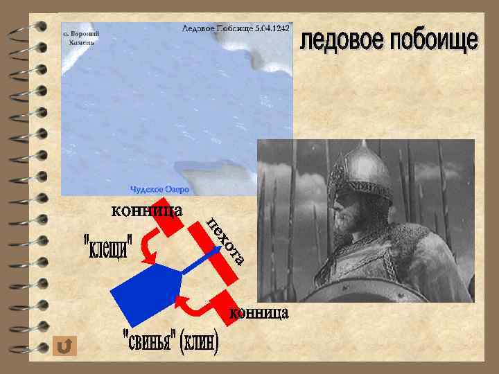 1240 – захват рыцарями Изборска, Пскова и всей Псковской земли Тактикаосвобождение 1242 – рыцарей: клином «свиньей» прорвать оборону Александром Невским русских, разбить их по частям Псковских земель Тактика Александра Невского: «клещи» - заманить рыцарский клин, ударить во фланги, в засаде – конная дружина, использовать природный фактор
