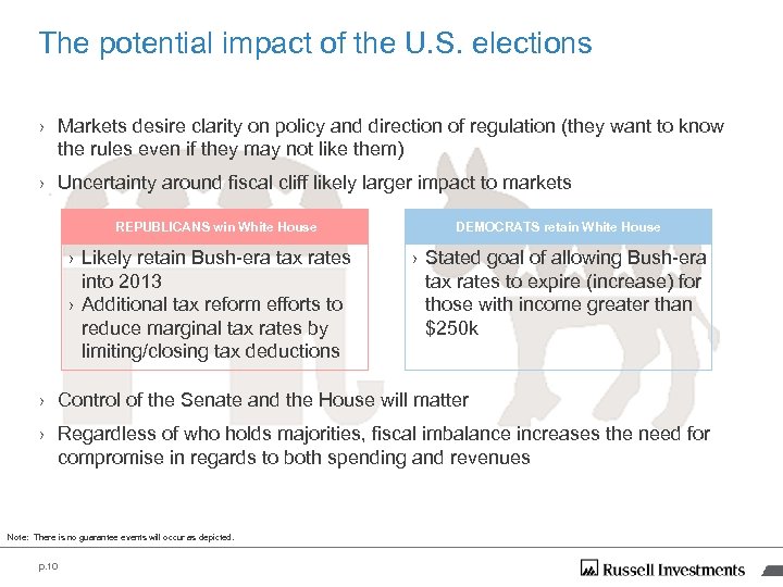 The potential impact of the U. S. elections › Markets desire clarity on policy and direction of regulation (they want to know the rules even if they may not like them) › Uncertainty around fiscal cliff likely larger impact to markets REPUBLICANS win White House › Likely retain Bush-era tax rates into 2013 › Additional tax reform efforts to reduce marginal tax rates by limiting/closing tax deductions DEMOCRATS retain White House › Stated goal of allowing Bush-era tax rates to expire (increase) for those with income greater than $250 k › Control of the Senate and the House will matter › Regardless of who holds majorities, fiscal imbalance increases the need for compromise in regards to both spending and revenues Note: There is no guarantee events will occur as depicted. p. 10