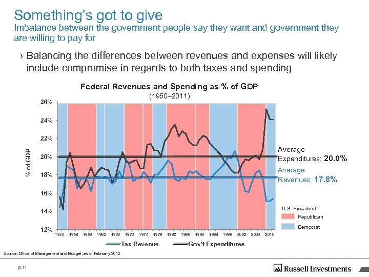 Something’s got to give Imbalance between the government people say they want and government they are willing to pay for › Balancing the differences between revenues and expenses will likely include compromise in regards to both taxes and spending Federal Revenues and Spending as % of GDP (1950– 2011) 26% 24% % of GDP 22% 20% Average Expenditures: 20. 0% 18% Average Revenues: 17. 8% 16% U. S. President: 14% 12% Republican Democrat 1950 1954 1958 1962 1966 1970 1974 1978 Tax Revenue Source: Office of Management and Budget, as of February 2012 p. 11 1982 1986 1990 1994 1998 2002 Gov’t Expenditures 2006 2010