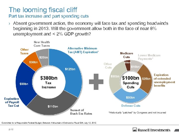 The looming fiscal cliff Part tax increase and part spending cuts › Absent government action, the economy will face tax and spending headwinds beginning in 2013. Will the government allow both in the face of near 8% unemployment and < 2% GDP growth? New Health Care Taxes Other Taxes Alternative Minimum Tax (AMT) Expiration* Medicare Cuts Lower Medicare Payments* Other Cuts $380 bn $100 bn Tax Increase Spending Cuts Expiration of Payroll Tax Cut Defense Cuts Sunset of Bush Era Rates Committee for a Responsible Federal Budget, Between A Mountain of Debt and a Fiscal Cliff, July 12, 2012. p. 12 Expiration of extended unemployment benefits *Historically “patched” by Congress and not incurred