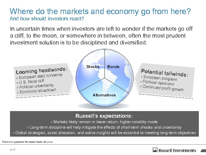 Where do the markets and economy go from here? And how should investors react? In uncertain times when investors are left to wonder if the markets go off a cliff, to the moon, or somewhere in between, often the most prudent investment solution is to be disciplined and diversified. inds: Looming headw concerns › European debt › U. S. fiscal cliff inty › Political uncerta own › Economic slowd Stocks Bonds Potential tail w inds: › European pro gress › Political dec isions › Continued p rofit growth Alternatives Russell’s expectations: › Markets likely remain in lower-return, higher-volatility mode › Long-term discipline will help mitigate the effects of short-term shocks and uncertainty › Global strategies, asset allocation, and active insights will be essential to meeting long-term objectives There is no guarantee the stated results will occur. p. 13
