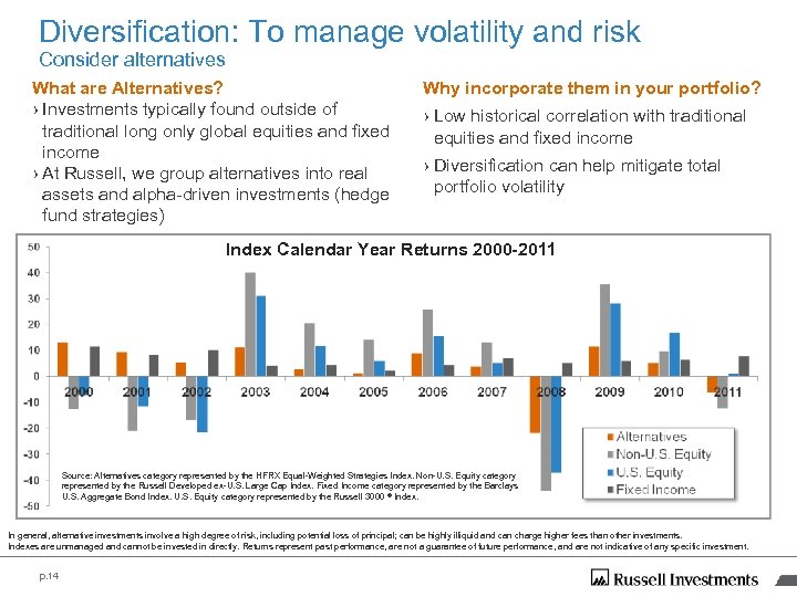 Diversification: To manage volatility and risk Consider alternatives What are Alternatives? › Investments typically found outside of traditional long only global equities and fixed income › At Russell, we group alternatives into real assets and alpha-driven investments (hedge fund strategies) Why incorporate them in your portfolio? › Low historical correlation with traditional equities and fixed income › Diversification can help mitigate total portfolio volatility Index Calendar Year Returns 2000 -2011 Source: Alternatives category represented by the HFRX Equal-Weighted Strategies Index. Non-U. S. Equity category represented by the Russell Developed ex-U. S. Large Cap Index. Fixed Income category represented by the Barclays U. S. Aggregate Bond Index. U. S. Equity category represented by the Russell 3000 ® Index. In general, alternative investments involve a high degree of risk, including potential loss of principal; can be highly illiquid and can charge higher fees than other investments. Indexes are unmanaged and cannot be invested in directly. Returns represent past performance, are not a guarantee of future performance, and are not indicative of any specific investment. p. 14