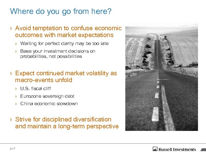 Where do you go from here? › Avoid temptation to confuse economic outcomes with market expectations › Waiting for perfect clarity may be too late › Base your investment decisions on probabilities, not possibilities › Expect continued market volatility as macro-events unfold › U. S. fiscal cliff › Eurozone sovereign debt › China economic slowdown › Strive for disciplined diversification and maintain a long-term perspective p. 17