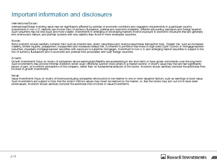 Important information and disclosures International/Global: International/Global investing value may be significantly affected by political or economic conditions and regulatory requirements in a particular country. Investments in non-U. S. markets can involve risks of currency fluctuation, political and economic instability, different accounting standards and foreign taxation. Such securities may be less liquid and more volatile. Investments in emerging or developing markets involve exposure to economic structures that are generally less diverse and mature, and political systems with less stability than those in more developed countries. Bonds: Bond investors should carefully consider risks such as interest rate, credit, repurchase and reverse repurchase transaction risks. Greater risk, such as increased volatility, limited liquidity, prepayment, nonpayment and increased default risk, is inherent in portfolios that invest in high-yield ("junk") bonds or mortgage backedsecurities, especially mortgage-backed securities with exposure to subprime mortgages. Investment in non-U. S. and emerging market securities is subject to the risk of currency fluctuations and to economic and political risks associated with such foreign countries. Growth: Growth investments focus on stocks of companies whose earnings/profitability are accelerating in the short-term or have grown consistently over the long-term. Such investments may provide minimal dividends which could otherwise cushion stock prices in a market decline. A stock’s value may rise and fall significantly based, in part, on investors' perceptions of the company, rather than on fundamental analysis of the stocks. Investors should carefully consider the additional risks involved in growth investments. Value: Value investments focus on stocks of income-producing companies whose price is low relative to one or more valuation factors, such as earnings or book value. Such investments are subject to risks that the stocks’ intrinsic values may never be realized by the market, or, that the stocks may turn out not to have been undervalued. Investors should carefully consider the additional risks involved in value investments. p. 18