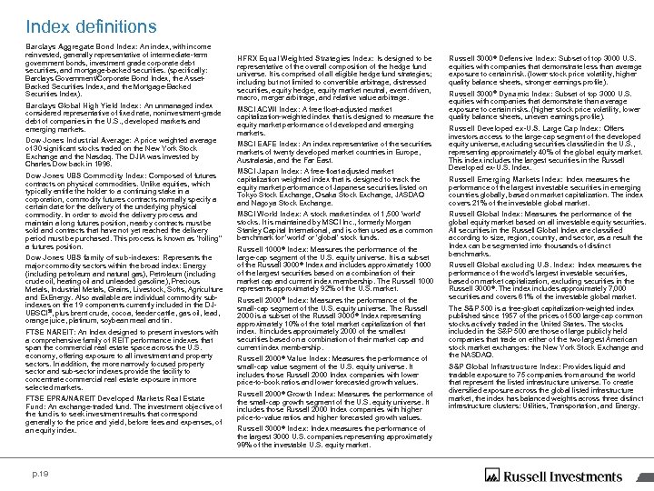 Index definitions Barclays Aggregate Bond Index: An index, with income reinvested, generally representative of intermediate-term government bonds, investment grade corporate debt securities, and mortgage-backed securities. (specifically: Barclays Government/Corporate Bond Index, the Asset. Backed Securities Index, and the Mortgage-Backed Securities Index). Barclays Global High Yield Index: An unmanaged index considered representative of fixed rate, noninvestment-grade debt of companies in the U. S. , developed markets and emerging markets. Dow Jones Industrial Average: A price weighted average of 30 significant stocks traded on the New York Stock Exchange and the Nasdaq. The DJIA was invested by Charles Dow back in 1896. Dow Jones UBS Commodity Index: Composed of futures contracts on physical commodities. Unlike equities, which typically entitle the holder to a continuing stake in a corporation, commodity futures contracts normally specify a certain date for the delivery of the underlying physical commodity. In order to avoid the delivery process and maintain a long futures position, nearby contracts must be sold and contracts that have not yet reached the delivery period must be purchased. This process is known as "rolling" a futures position. Dow Jones UBS family of sub-indexes: Represents the major commodity sectors within the broad index: Energy (including petroleum and natural gas), Petroleum (including crude oil, heating oil and unleaded gasoline), Precious Metals, Industrial Metals, Grains, Livestock, Softs, Agriculture and Ex. Energy. Also available are individual commodity subindexes on the 19 components currently included in the DJUBSCI℠, plus brent crude, cocoa, feeder cattle, gas oil, lead, orange juice, platinum, soybean meal and tin. FTSE NAREIT: An Index designed to present investors with a comprehensive family of REIT performance indexes that span the commercial real estate space across the U. S. economy, offering exposure to all investment and property sectors. In addition, the more narrowly focused property sector and sub-sector indexes provide the facility to concentrate commercial real estate exposure in more selected markets. FTSE EPRA/NAREIT Developed Markets Real Estate Fund: An exchange-traded fund. The investment objective of the fund is to seek investment results that correspond generally to the price and yield, before fees and expenses, of an equity index. p. 19 HFRX Equal Weighted Strategies Index: Is designed to be representative of the overall composition of the hedge fund universe. It is comprised of all eligible hedge fund strategies; including but not limited to convertible arbitrage, distressed securities, equity hedge, equity market neutral, event driven, macro, merger arbitrage, and relative value arbitrage. MSCI ACWI Index: A free float-adjusted market capitalization-weighted index that is designed to measure the equity market performance of developed and emerging markets. MSCI EAFE Index: An index representative of the securities markets of twenty developed market countries in Europe, Australasia, and the Far East. MSCI Japan Index: A free-float adjusted market capitalization weighted index that is designed to track the equity market performance of Japanese securities listed on Tokyo Stock Exchange, Osaka Stock Exchange, JASDAQ and Nagoya Stock Exchange. MSCI World Index: A stock market index of 1, 500 'world' stocks. It is maintained by MSCI Inc. , formerly Morgan Stanley Capital International, and is often used as a common benchmark for 'world' or 'global' stock funds. Russell 1000 ® Index: Measures the performance of the large-cap segment of the U. S. equity universe. It is a subset of the Russell 3000 ® Index and includes approximately 1000 of the largest securities based on a combination of their market cap and current index membership. The Russell 1000 represents approximately 92% of the U. S. market. Russell 2000 ® Index: Measures the performance of the small-cap segment of the U. S. equity universe. The Russell 2000 is a subset of the Russell 3000 ® Index representing approximately 10% of the total market capitalization of that index. It includes approximately 2000 of the smallest securities based on a combination of their market cap and current index membership. Russell 2000 ® Value Index: Measures the performance of small-cap value segment of the U. S. equity universe. It includes those Russell 2000 Index companies with lower price-to-book ratios and lower forecasted growth values. Russell 2000 ® Growth Index: Measures the performance of the small-cap growth segment of the U. S. equity universe. It includes those Russell 2000 Index companies with higher price-to-value ratios and higher forecasted growth values. Russell 3000 ® Index: Index measures the performance of the largest 3000 U. S. companies representing approximately 98% of the investable U. S. equity market. Russell 3000 ® Defensive Index: Subset of top 3000 U. S. equities with companies that demonstrate less than average exposure to certain risk. (lower stock price volatility, higher quality balance sheets, stronger earnings profile). Russell 3000 ® Dynamic Index: Subset of top 3000 U. S. equities with companies that demonstrate than average exposure to certain risks. (higher stock price volatility, lower quality balance sheets, uneven earnings profile). Russell Developed ex-U. S. Large Cap Index: Offers investors access to the large-cap segment of the developed equity universe, excluding securities classified in the U. S. , representing approximately 40% of the global equity market. This index includes the largest securities in the Russell Developed ex-U. S. Index. Russell Emerging Markets Index: Index measures the performance of the largest investable securities in emerging countries globally, based on market capitalization. The index covers 21% of the investable global market. Russell Global Index: Measures the performance of the global equity market based on all inv