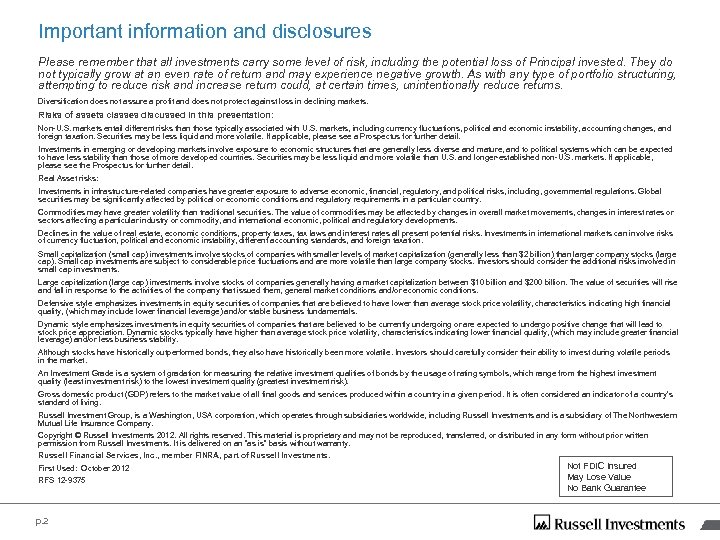 Important information and disclosures Please remember that all investments carry some level of risk, including the potential loss of Principal invested. They do not typically grow at an even rate of return and may experience negative growth. As with any type of portfolio structuring, attempting to reduce risk and increase return could, at certain times, unintentionally reduce returns. Diversification does not assure a profit and does not protect against loss in declining markets. Risks of assets classes discussed in this presentation: Non-U. S. markets entail different risks than those typically associated with U. S. markets, including currency fluctuations, political and economic instability, accounting changes, and foreign taxation. Securities may be less liquid and more volatile. If applicable, please see a Prospectus for further detail. Investments in emerging or developing markets involve exposure to economic structures that are generally less diverse and mature, and to political systems which can be expected to have less stability than those of more developed countries. Securities may be less liquid and more volatile than U. S. and longer-established non-U. S. markets. If applicable, please see the Prospectus for further detail. Real Asset risks: Investments in infrastructure-related companies have greater exposure to adverse economic, financial, regulatory, and political risks, including, governmental regulations. Global securities may be significantly affected by political or economic conditions and regulatory requirements in a particular country. Commodities may have greater volatility than traditional securities. The value of commodities may be affected by changes in overall market movements, changes in interest rates or sectors affecting a particular industry or commodity, and international economic, political and regulatory developments. Declines in the value of real estate, economic conditions, property taxes, tax laws and interest rates all present potential risks. Investments in international markets can involve risks of currency fluctuation, political and economic instability, different accounting standards, and foreign taxation. Small capitalization (small cap) investments involve stocks of companies with smaller levels of market capitalization (generally less than $2 billion) than larger company stocks (large cap). Small cap investments are subject to considerable price fluctuations and are more volatile than large company stocks. Investors should consider the additional risks involved in small cap investments. Large capitalization (large cap) investments involve stocks of companies generally having a market capitalization between $10 billion and $200 billion. The value of securities will rise and fall in response to the activities of the company that issued them, general market conditions and/or economic conditions. Defensive style emphasizes investments in equity securities of companies that are believed to have lower than average stock price volatility, characteristics indicating high financial quality, (which may include lower financial leverage) and/or stable business fundamentals. Dynamic style emphasizes investments in equity securities of companies that are believed to be currently undergoing or are expected to undergo positive change that will lead to stock price appreciation. Dynamic stocks typically have higher than average stock price volatility, characteristics indicating lower financial quality, (which may include greater financial leverage) and/or less business stability. Although stocks have historically outperformed bonds, they also have historically been more volatile. Investors should carefully consider their ability to invest during volatile periods in the market. An Investment Grade is a system of gradation for measuring the relative investment qualities of bonds by the usage of rating symbols, which range from the highest investment quality (least investment risk) to the lowest investment quality (greatest investment risk). Gross domestic product (GDP) refers to the market value of all final goods and services produced within a country in a given period. It is often considered an indicator of a country's standard of living. Russell Investment Group, is a Washington, USA corporation, which operates through subsidiaries worldwide, including Russell Investments and is a subsidiary of The Northwestern Mutual Life Insurance Company. Copyright © Russell Investments 2012. All rights reserved. This material is proprietary and may not be reproduced, transferred, or distributed in any form without prior written permission from Russell Investments. It is delivered on an “as is” basis without warranty. Russell Financial Services, Inc. , member FINRA, part of Russell Investments. First Used: October 2012 RFS 12 -9375 p. 2 Not FDIC Insured May Lose Value No Bank Guarantee