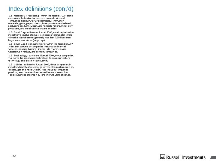 Index definitions (cont’d) U. S. Material & Processing: Within the Russell 3000, those companies that extract or process raw materials, and companies that manufacture chemicals, construction materials, glass, paper, plastic, forest products and related packaging products. Metals and minerals miners, metal alloy producers, and metal fabricators are included. U. S. Small Cap: Within the Russell 2000, small capitalization investments involve stocks of companies with smaller levels of market capitalization (generally less than $2 billion) than larger company stocks (large cap). U. S. Small Cap Financials: Sector within the Russell 2000 ® Index that consists of companies that provide financial services including banking, finance, life insurance, and securities brokerage, and services companies. U. S. Technology: Within the Russell 3000, those companies that serve the information technology, telecommunications technology and electronics industries. U. S. Utilities: Within the Russell 3000, those companies in industries heavily affected by government regulation, such as electric, gas and water utilities. Also includes companies providing telephone services, as well as companies that operate as independent producers or distributors of power. p. 20
