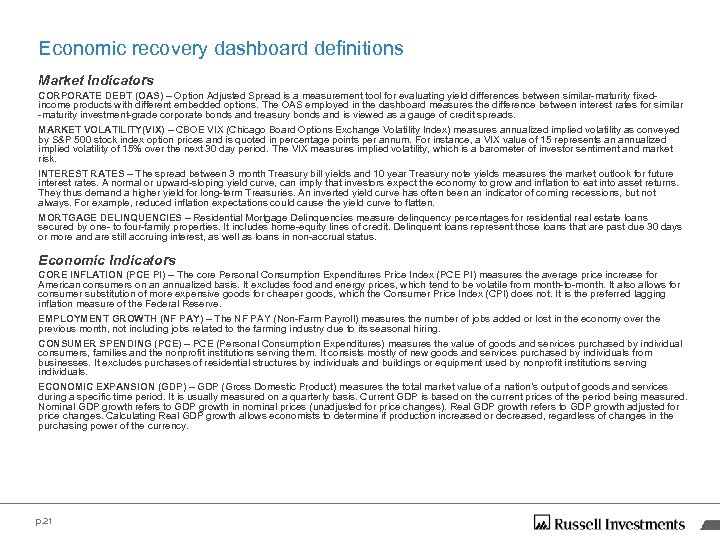 Economic recovery dashboard definitions Market Indicators CORPORATE DEBT (OAS) – Option Adjusted Spread is a measurement tool for evaluating yield differences between similar-maturity fixedincome products with different embedded options. The OAS employed in the dashboard measures the difference between interest rates for similar -maturity investment-grade corporate bonds and treasury bonds and is viewed as a gauge of credit spreads. MARKET VOLATILITY(VIX) – CBOE VIX (Chicago Board Options Exchange Volatility Index) measures annualized implied volatility as conveyed by S&P 500 stock index option prices and is quoted in percentage points per annum. For instance, a VIX value of 15 represents an annualized implied volatility of 15% over the next 30 day period. The VIX measures implied volatility, which is a barometer of investor sentiment and market risk. INTEREST RATES – The spread between 3 month Treasury bill yields and 10 year Treasury note yields measures the market outlook for future interest rates. A normal or upward-sloping yield curve, can imply that investors expect the economy to grow and inflation to eat into asset returns. They thus demand a higher yield for long-term Treasuries. An inverted yield curve has often been an indicator of coming recessions, but not always. For example, reduced inflation expectations could cause the yield curve to flatten. MORTGAGE DELINQUENCIES – Residential Mortgage Delinquencies measure delinquency percentages for residential real estate loans secured by one- to four-family properties. It includes home-equity lines of credit. Delinquent loans represent those loans that are past due 30 days or more and are still accruing interest, as well as loans in non-accrual status. Economic Indicators CORE INFLATION (PCE PI) – The core Personal Consumption Expenditures Price Index (PCE PI) measures the average price increase for American consumers on an annualized basis. It excludes food and energy prices, which tend to be volatile from month-to-month. It also allows for consumer substitution of more expensive goods for cheaper goods, which the Consumer Price Index (CPI) does not. It is the preferred lagging inflation measure of the Federal Reserve. EMPLOYMENT GROWTH (NF PAY) – The NF PAY (Non-Farm Payroll) measures the number of jobs added or lost in the economy over the previous month, not including jobs related to the farming industry due to its seasonal hiring. CONSUMER SPENDING (PCE) – PCE (Personal Consumption Expenditures) measures the value of goods and services purchased by individual consumers, families and the nonprofit institutions serving them. It consists mostly of new goods and services purchased by individuals from businesses. It excludes purchases of residential structures by individuals and buildings or equipment used by nonprofit institutions serving individuals. ECONOMIC EXPANSION (GDP) – GDP (Gross Domestic Product) measures the total market value of a nation’s output of goods and services during a specific time period. It is usually measured on a quarterly basis. Current GDP is based on the current prices of the period being measured. Nominal GDP growth refers to GDP growth in nominal prices (unadjusted for price changes). Real GDP growth refers to GDP growth adjusted for price changes. Calculating Real GDP growth allows economists to determine if production increased or decreased, regardless of changes in the purchasing power of the currency. p. 21
