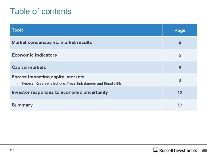 Table of contents Topic Page Market consensus vs. market results 4 Economic indicators 5 Capital markets 6 Forces impacting capital markets › Federal Reserve, elections, fiscal imbalances and fiscal cliffs 8 Investor responses to economic uncertainty 13 Summary 17 p. 3