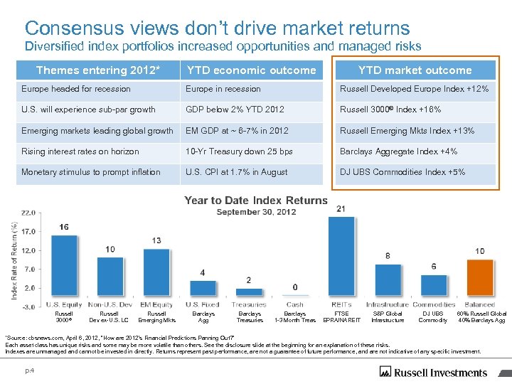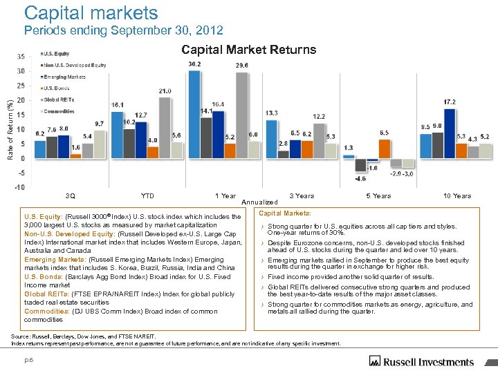 Consensus views don’t drive market returns Diversified index portfolios increased opportunities and managed risks Themes entering 2012* YTD economic outcome YTD market outcome Europe headed for recession Europe in recession Russell Developed Europe Index +12% U. S. will experience sub-par growth GDP below 2% YTD 2012 Russell 3000® Index +16% Emerging markets leading global growth EM GDP at ~ 6 -7% in 2012 Russell Emerging Mkts Index +13% Rising interest rates on horizon 10 -Yr Treasury down 25 bps Barclays Aggregate Index +4% Monetary stimulus to prompt inflation U. S. CPI at 1. 7% in August DJ UBS Commodities Index +5% Russell 3000® Russell Dev ex-U. S. LC Russell Emerging Mkts Barclays Agg Barclays Treasuries Barclays 1 -3 Month Treas FTSE EPRA/NAREIT S&P Global Infrastructure DJ UBS Commodity 60% Russell Global 40% Barclays Agg *Source: cbsnews. com, April 6, 2012, “How are 2012’s Financial Predictions Panning Out? ” Each asset class has unique risks and some may be more volatile than others. See the disclosure slide at the beginning for an explanation of these risks. Indexes are unmanaged and cannot be invested in directly. Returns represent past performance, are not a guarantee of future performance, and are not indicative of any specific investment. p. 4