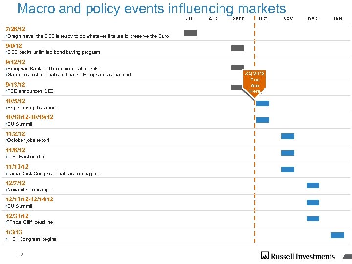 What worked and what didn’t in 3 Q 2012 What worked › Equities What didn’t work › Equities › Energy +10% / Cons. Disc. +8% › Cons. Staples +3% / Utilities +4% › Dynamic Stocks +7% › Defensive Stocks +5% › Euro Area +10% › Japan 0% › Fixed Income › Emerging Market Debt +7% › Fixed Income › U. S. Treasuries +1% › Global High Yield +6% › Alternatives/Real Assets › Grains +16% / Precious Metals +13% › Livestock -6% / Sugar -6% › Infrastructure: Energy +7% › Infrastructure: Utilities +1% › REITs Asia +13% › REITs North America +1% Defensive Stocks: Securities that tend to be higher quality, more stable. Dynamic Stocks: Securities that tend to be less stable and have greater return potential. Looking at a stock’s price volatility and balance sheet quality allow for classification between these stability indexes: Defensive/Dynamic Index Legend: Energy – Russell 3000 ® U. S. Energy; Consumer Discretionary – Russell 3000 ® Consumer Discretionary; Consumer Staples – Russell 3000 ® Consumer Staples; Utilities – Russell 3000 ® Utilities; Dynamic – Russell 1000 ® Dynamic Index; Defensive – Russell 1000 ® Defensive Index; Euro Area – Russell Eurozone Index; Japan – Russell Japan Index; Emerging Market Debt – Barclays Emerging Mkt Debt Index; U. S. Treasuries – Barclays U. S. Treasury Index; Global High Yield – Barclays Global HY Index; Grains, Livestock, Precious Metals, Sugar, represent sub-indexes of the Dow Jones UBS Commodity Sub-index Series; Infrastructure Energy – S&P Global Listed Infrastructure Sub-index Sector; Infrastructure: Utilities – S&P Global Listed Infrastructure Sub-index Sector; REITs Asia – FTSE/EPRA NAREIT Developed Asia Sector; REITs North America – FTSE/EPRA NAREIT Developed North America Sector. Indexes are unmanaged and cannot be invested in directly. Returns represent past performance, are not a guarantee of future performance, and are not indicative of any specific investment. p. 7