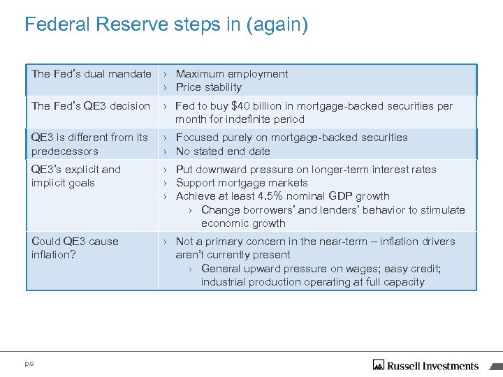 Federal Reserve steps in (again) The Fed’s dual mandate › Maximum employment › Price stability The Fed’s QE 3 decision › Fed to buy $40 billion in mortgage-backed securities per month for indefinite period QE 3 is different from its predecessors › Focused purely on mortgage-backed securities › No stated end date QE 3’s explicit and implicit goals › Put downward pressure on longer-term interest rates › Support mortgage markets › Achieve at least 4. 5% nominal GDP growth › Change borrowers’ and lenders’ behavior to stimulate economic growth Could QE 3 cause inflation? › Not a primary concern in the near-term – inflation drivers aren’t currently present › General upward pressure on wages; easy credit; industrial production operating at full capacity p. 9