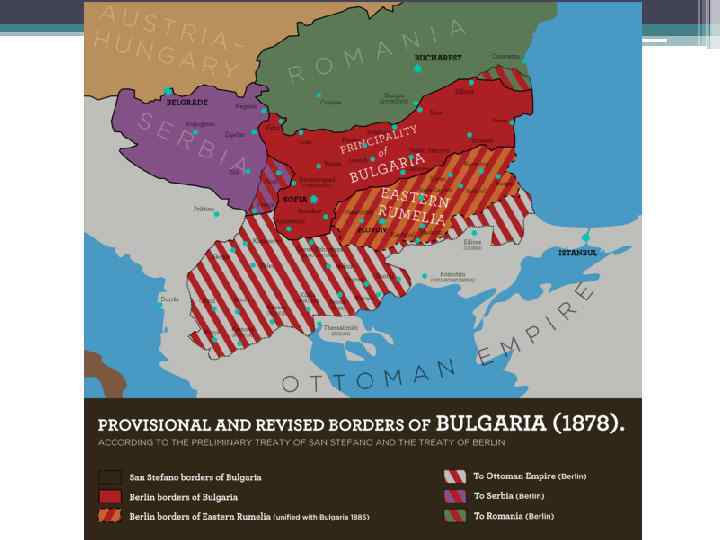 Russo-Turkish War (1877) • Pan-Slavists encouraged Alexander II to promote Slavic nationalism in the Balkans • 1876: Serbs rebelled against the Ottoman Empire • 1877: Russia invaded the Balkan provinces of the Ottoman Empire and won decisively • Treaty of San Stefano ▫ Independence for Romania, Serbia, Montenegro, and Bulgaria ▫ Russian hegemony in the Balkans ▫ Ottoman Empire significantly weakened • Congress of Berlin ▫ All European nations saw Russian victory as a threat to the balance of power ▫ Intention to keep Constantinople safely under Ottoman control ▫ Bulgaria was reduced in size and made an autonomous province of the Ottoman Empire ▫ Macedonia and Eastern Rumelia returned to Ottoman rule ▫ Bosnia made a protectorate of Austria-Hungary ▫ Serbia, Bulgaria and Greece unsatisfied with gains ▫ Russia humiliated angry after diplomatic failing following military victory ▫ Russians outraged at Bismarck’s duplicity ▫ Shattered the Three Emperor’s League