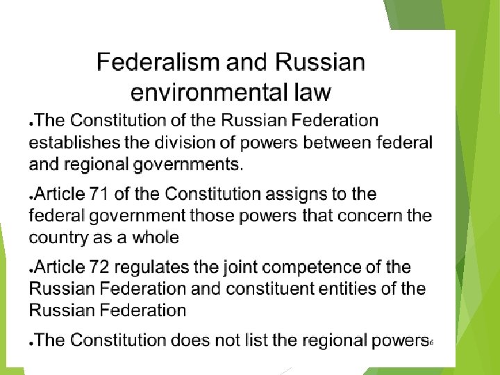 Environmental legislation declarative, fragmented, inadequate and inconsistent, sometimes unrealistic Problems with implementation Both federal and regional legislation Regional legislation is sometimes more progressive The quality of regional legislation has improved in 2000 s Environmental acts, e. g. : Act on environmental protection Water code, land code, forest code Act on environmental expert review Act on protected nature areas