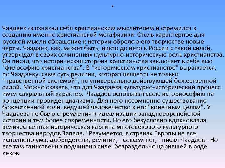 . Чаадаев осознавал себя христианским мыслителем и стремился к созданию именно христианской метафизики. Столь характерное для русской мысли обращение к истории обрело в его творчестве новые черты. Чаадаев, как, может быть, никто до него в России с такой силой, утверждал в своих сочинениях культурно-историческую роль христианства. Он писал, что историческая сторона христианства заключает в себе всю "философию христианства". В "историческом христианстве" выражается, по Чаадаеву, сама суть религии, которая является не только "нравственной системой", но универсально действующей божественной силой. Можно сказать, что для Чаадаева культурно-исторический процесс имел сакральный характер. Чаадаев основывал свою историософию на концепции провиденциализма. Для него несомненно существование божественной воли, ведущей человечество к его "конечным целям". У Чаадаева не было стремления к идеализации западноевропейской истории и тем более современности. Но его безусловно вдохновляла величественная историческая картина многовекового культурного творчества народов Запада. "Разумеется, в странах Европы не все исполнено ума, добродетели, религии, - совсем нет, - писал Чаадаев - Но все там таинственно подчинено силе, безраздельно царившей в ряде веков