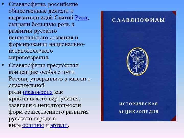 • Славянофилы, российские общественные деятели и выразители идей Святой Руси, сыграли большую роль в развитии русского национального сознания и формировании национальнопатриотического мировоззрения. • Славянофилы предложили концепцию особого пути России, утвердились в мысли о спасительной роли правоверия как христианского вероучения, заявляли о неповторимости форм общественного развития русского народа в виде общины и артели.