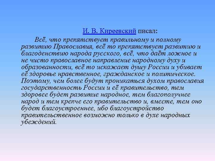 И. В. Киреевский писал: Всё, что препятствует правильному и полному развитию Православия, всё то препятствует развитию и благоденствию народа русского, всё, что даёт ложное и не чисто православное направление народному духу и образованности, всё то искажает душу России и убивает её здоровье нравственное, гражданское и политическое. Поэтому, чем более будут проникаться духом православия государственность России и её правительство, тем здоровее будет развитие народное, тем благополучнее народ и тем крепче его правительство и, вместе, тем оно будет благоустроеннее, ибо благоустройство правительственное возможно только в духе народных убеждений.