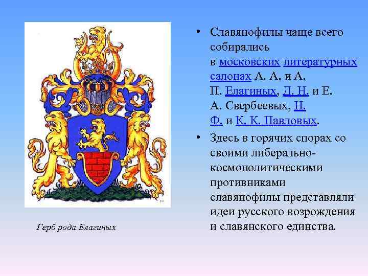 Герб рода Елагиных • Славянофилы чаще всего собирались в московских литературных салонах А. А. и А. П. Елагиных, Д. Н. и Е. А. Свербеевых, Н. Ф. и К. К. Павловых. • Здесь в горячих спорах со своими либеральнокосмополитическими противниками славянофилы представляли идеи русского возрождения и славянского единства.