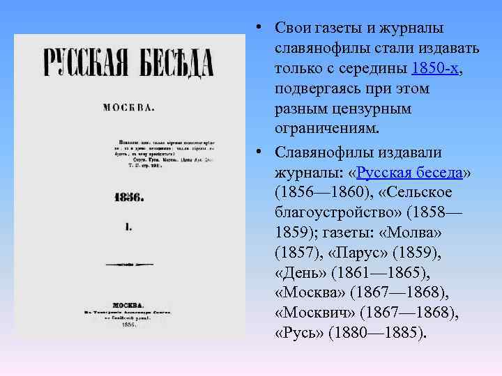 • Свои газеты и журналы славянофилы стали издавать только с середины 1850 -х, подвергаясь при этом разным цензурным ограничениям. • Славянофилы издавали журналы: «Русская беседа» (1856— 1860), «Сельское благоустройство» (1858— 1859); газеты: «Молва» (1857), «Парус» (1859), «День» (1861— 1865), «Москва» (1867— 1868), «Москвич» (1867— 1868), «Русь» (1880— 1885).