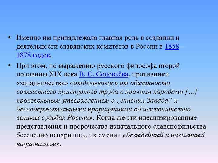 • Именно им принадлежала главная роль в создании и деятельности славянских комитетов в России в 1858— 1878 годов. • При этом, по выражению русского философа второй половины XIX века В. С. Соловьёва, противники «западничества» «отделывались от обязанности совместного культурного труда с прочими народами […] произвольным утверждением о „гниении Запада“ и бессодержательными прорицаниями об исключительно великих судьбах России» . Когда же эти идеализированные представления и пророчества изначального славянофильства бесследно испарились, их сменил «безыдейный и низменный национализм» .
