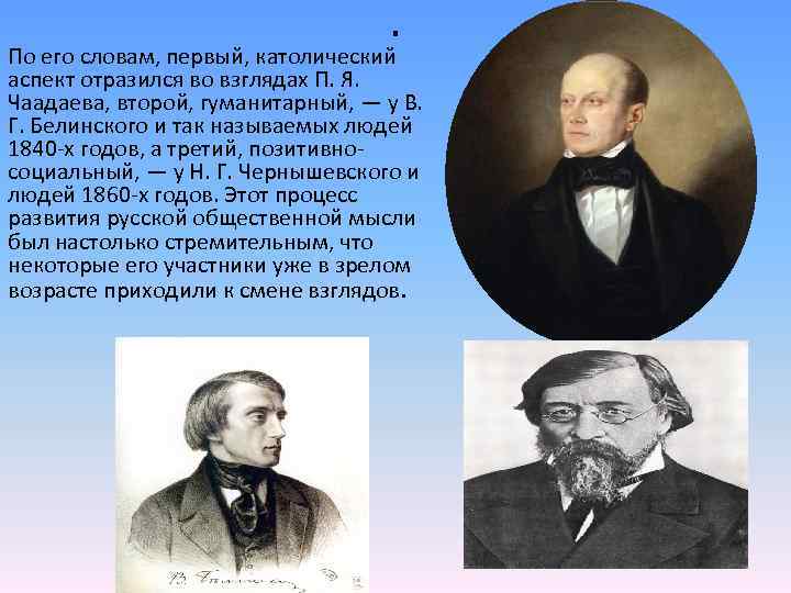 . По его словам, первый, католический аспект отразился во взглядах П. Я. Чаадаева, второй, гуманитарный, — у В. Г. Белинского и так называемых людей 1840 -х годов, а третий, позитивносоциальный, — у Н. Г. Чернышевского и людей 1860 -х годов. Этот процесс развития русской общественной мысли был настолько стремительным, что некоторые его участники уже в зрелом возрасте приходили к смене взглядов.