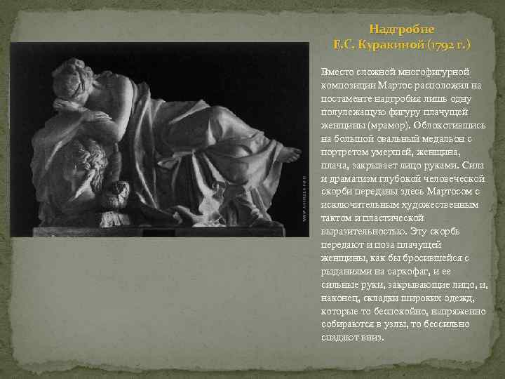 Надгробие Е. С. Куракиной (1792 г. ) Вместо сложной многофигурной композиции Мартос расположил на постаменте надгробия лишь одну полулежащую фигуру плачущей женщины (мрамор). Облокотившись на большой овальный медальон с портретом умершей, женщина, плача, закрывает лицо руками. Сила и драматизм глубокой человеческой скорби переданы здесь Мартосом с исключительным художественным тактом и пластической выразительностью. Эту скорбь передают и поза плачущей женщины, как бы бросившейся с рыданиями на саркофаг, и ее сильные руки, закрывающие лицо, и, наконец, складки широких одежд, которые то беспокойно, напряженно собираются в узлы, то бессильно спадают вниз.