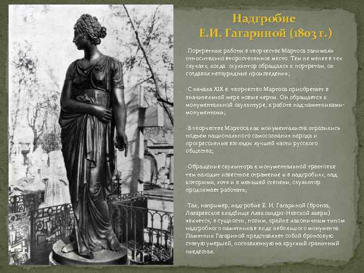 Надгробие Е. И. Гагариной (1803 г. ) -Портретные работы в творчестве Мартоса занимали относительно второстепенное место. Тем не менее в тех случаях, когда скульптор обращался к портретам, он создавал незаурядные произведения; -С начала XIX в. творчество Мартоса приобретает в значительной мере новые черты. Он обращается к монументальной скульптуре, к работе над памятникамимонументами; -В творчестве Мартоса как монументалиста отразились подъем национального самосознания народа и прогрессивные взгляды лучшей части русского общества; -Обращение скульптора к монументальной трактовке тем находит известное отражение и в надгробиях, над которыми, хотя и в меньшей степени, скульптор продолжает работать; -Так, например, надгробие Е. И. Гагариной (бронза, Лазаревское кладбище Александро-Невской лавры) является, в сущности, новым, крайне лаконичным типом надгробного памятника в виде небольшого монумента. Памятник Гагариной представляет собой бронзовую статую умершей, поставленную на круглый гранитный пьедестал.