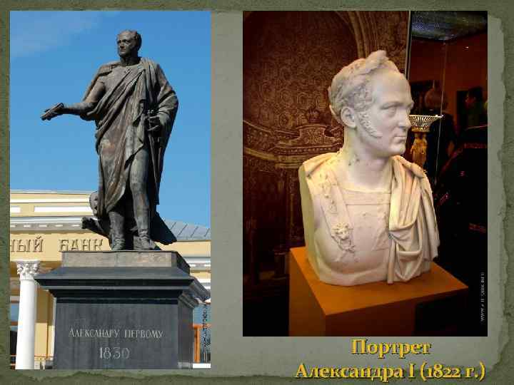 Архитектура - В первой половине XIX в. , в отличие от других видов искусства, сохраняет свои позиции классицизм, вступивший в стадию наивысшего развития – зрелый или высокий классицизм, именуемый русским ампиром; ампиром - Основной особенностью ампира является обязательное наличие пилястров, колонн, лепных карнизов, а также мотивов, репродуцирующих античные образцы скульптуры (сфинксов, грифонов, львиных лап и т. п. ); - В Российской империи стиль ампир стал известен в начале XIX века (точнее – в 1812 году) благодаря императору Александру I, который довольно часто приглашал в Россию архитекторов-иностранцев;