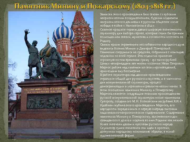 Памятник Минину и Пожарскому (18 о 4 -1818 гг. ) Замысел этого произведения был связан с глубоким патриотическим воодушевлением, бурным подъемом патриотического движения в русском обществе после победы в войне с Наполеоном в 1812 г. Славное прошлое страны давало широкую возможность скульптору для выбора героев, которые стали бы зримым воплощением отваги, мужества и готовности постоять за Родину. Самым ярким отражением несгибаемости народного духа виделись Козьма Минин и Дмитрий Пожарский. Памятник сооружался на средства, собранные с помощью подписки по всей стране. Эта подписка принесла огромную по тем временам сумму - 150 тысяч рублей. Целых четырнадцать лет жизни посвятил Иван Петрович Мартос работе над главным из своих произведений, принесшим ему бессмертие. В работе скульптора над данным произведением отразился общий для русского искусства, и в частности для монументальной скульптуры, процесс демократизации и укрепления реалистических начал. В этом отношении памятник Минину и Пожарскому Мартоса является следующим этапным произведением русской монументальной скульптуры после памятника Суворову, созданного М. И. Козловским на рубеже XIX в. Идейная глубина этого произведения Мартоса, его народность определялись в первую очередь высоким национально-патриотическим содержанием. Содержание памятника Минину и Пожарскому, заложенные идеи гражданского долга и подвига во имя Родины как нельзя более отвечали делам и чувствам русского народа. Скульптор сумел воплотить эти идеи в простых, доступных народному пониманию образах, в ясной художественной форме.
