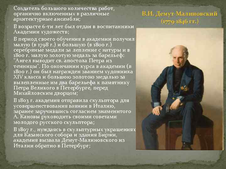 - - - Создатель большого количества работ, органично включенных в различные В. И. Демут-Малиновский архитектурные ансамбли; (1779 -1846 гг. ) В возрасте 6 -ти лет был отдан в воспитанники Академии художеств; В период своего обучения в академии получил малую (в 1798 г. ) и большую (в 1800 г. ) серебряные медали за лепление с натуры и в 1800 г. малую золотую медаль за барельеф: "Ангел выводит св. апостола Петра из темницы". По окончании курса в академии (в 1800 г. ) он был награжден званием художника ХІV класса и большою золотою медалью за вылепленные им два барельефа к памятнику Петра Великого в Петербурге, перед Михайловским дворцом; В 1803 г. академия отправила скульптора для усовершенствования ваянии в Италию, заранее заручившись согласием знаменитого А. Кановы руководить своими советами молодого русского скульптора; В 1807 г. , нуждаясь в скульптурных украшениях для Казанского собора и здания Биржи, академия вызвала Демут-Малиновского из Италии обратно в Петербург;
