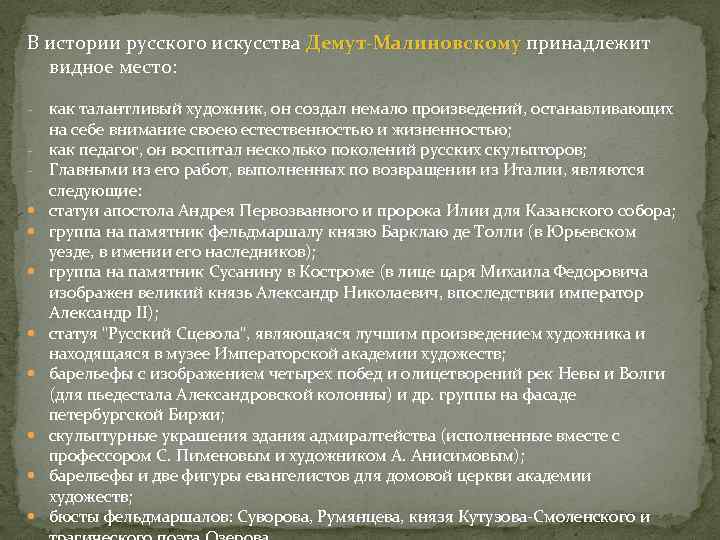 В истории русского искусства Демут-Малиновскому принадлежит Демут-Малиновскому видное место: как талантливый художник, он создал немало произведений, останавливающих на себе внимание своею естественностью и жизненностью; как педагог, он воспитал несколько поколений русских скульпторов; Главными из его работ, выполненных по возвращении из Италии, являются следующие: статуи апостола Андрея Первозванного и пророка Илии для Казанского собора; группа на памятник фельдмаршалу князю Барклаю де Толли (в Юрьевском уезде, в имении его наследников); группа на памятник Сусанину в Костроме (в лице царя Михаила Федоровича изображен великий князь Александр Николаевич, впоследствии император Александр II); статуя "Русский Сцевола", являющаяся лучшим произведением художника и находящаяся в музее Императорской академии художеств; барельефы с изображением четырех побед и олицетворений рек Невы и Волги (для пьедестала Александровской колонны) и др. группы на фасаде петербургской Биржи; скульптурные украшения здания адмиралтейства (исполненные вместе с профессором С. Пименовым и художником А. Анисимовым); барельефы и две фигуры евангелистов для домовой церкви академии художеств; бюсты фельдмаршалов: Суворова, Румянцева, князя Кутузова-Смоленского и