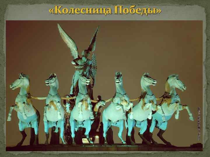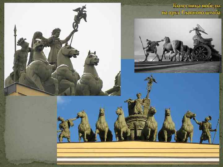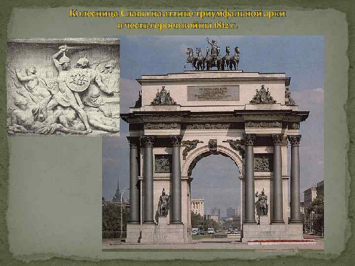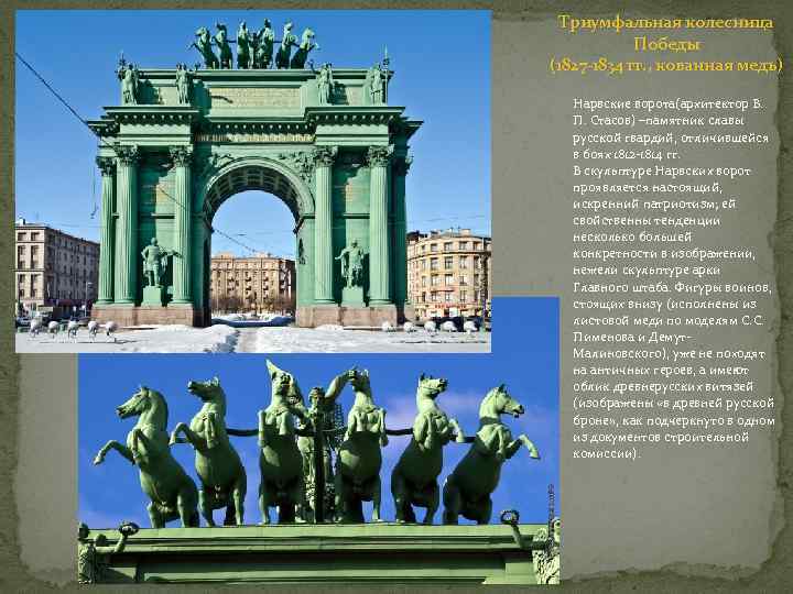 Триумфальная колесница Победы (1827 -1834 гг. , кованная медь) Нарвские ворота(архитектор В. П. Стасов) –памятник славы русской гвардий, отличившейся в боях 1812 -1814 гг. В скульптуре Нарвских ворот проявляется настоящий, искренний патриотизм; ей свойственны тенденции несколько большей конкретности в изображении, нежели скульптуре арки Главного штаба. Фигуры воинов, стоящих внизу (исполнены из листовой меди по моделям С. С. Пименова и Демут. Малиновского), уже не походят на античных героев, а имеют облик древнерусских витязей (изображены «в древней русской броне» , как подчеркнуто в одном из документов строительной комиссии).