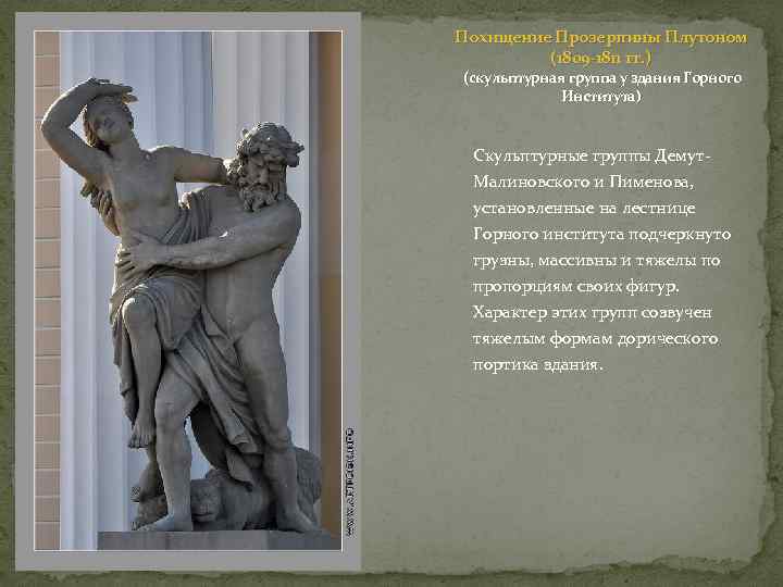 Похищение Прозерпины Плутоном (1809 -1811 гг. ) (скульптурная группа у здания Горного Института) Скульптурные группы Демут. Малиновского и Пименова, установленные на лестнице Горного института подчеркнуто грузны, массивны и тяжелы по пропорциям своих фигур. Характер этих групп созвучен тяжелым формам дорического портика здания.