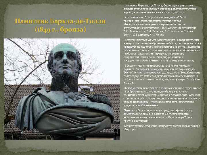 -памятник Барклаю де Толли, был открыт уже после смерти скульптора в 1849 г. (начало работы скульптора над моделью монумента относится к 30 -м гг. ); Памятник Баркла-де-Толли (1849 г. , бронза) -К составлению "рисунка сего монумента” была привлечена многочисленная группа членов Императорской Академии художеств "по части скульптуры и архитектуры”: В. И. Демут-Малиновский, А. И. Мельников, В. И. Беретти, А. П. Брюллов, братья Тоны, С. Галдберг, Х. Ф. Мейер; -Конкурс выиграл Демут-Малиновский, решив монумент в виде колоссального бронзового бюста, поставленного на пьедестал из красного полированного гранита. Подножие памятника со всех сторон ваятель украсил исполненными из бронзы различными предметами военного снаряжения: знаменами, обмундированием и вооружением того времени в натуральную величину; -В верхней части пьедестала золочеными литерами надпись: "Генералу-фельдмаршалу князю Барклаю-де. Толли”. Ниже на мраморной доске другая: "Незабвенному полководцу от войск под начальством его состоявших, в память военных подвигов 1812, 1813 и 1814 годов. Сооружен в 1848 г. ”; -Фельдмаршал изображен в военном мундире, через плечо переброшен плащ, что придает бюсту несколько романтический характер. Глубокая посадка глаз, характер осанки, поворот головы создают впечатление величавого образа полководца – несколько сурового, замкнутого, ушедшего в себя человека. Памятник был воздвигнут на средства офицеров 1 -го армейского корпуса (в размере 60 тысяч рублей), действовавшего под начальством Барклая-де-Толли против французов. Торжественное открытие монумента состоялось 11 ноября 1849 года.