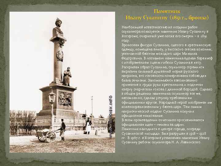 Памятник Ивану Сусанину (1851 г. , бронза) Наибольшей известностью из поздних работ скульптора пользуется памятник Ивану Сусанину в Костроме, открытый уже после его смерти – в 1851 году. Бронзовая фигура Сусанина, одетого в крестьянскую одежду, помещена внизу, у высокого ствола колонны, увенчанной бюстом молодого царя Михаила Федоровича. В постамент памятника вделан барельеф с изображением сцены гибели Сусанина в лесу. Раскрывая образ Сусанина, скульптор стремился выразить сильный душевный порыв русского патриота, его готовность пожертвовать собою для блага отчизны. Запоминаются взволнованно прижатые к груди руки крестьянина и поднятая кверху старческая голова с длинной бородой. Однако в общем решении памятника скульптор все же, несомненно, сделал уступку требованиям официальных кругов. Народный герой изображен им коленопреклоненным у бюста царя. Тем самым патриотический подвиг Сусанина получил официозное толкование. В этом произведении отчетливо прослеживается официальная идея – «жизнь за царя» . Памятник находился в центре города, посреди Сусанинской площади. Был разрушен в 1918 – 1928 гг.