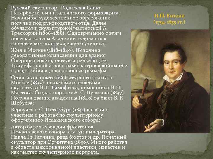 - - Русский скульптор. Родился в Санкт. Петербурге, сын итальянского формовщика. Начальное художественное образование получил под руководством отца. Далее обучался в скульптурной мастерской А. Трескорни (1806– 1818). Одновременно с этим посещал классы Академии художеств в качестве вольноприходящего ученика; Жил в Москве (1818– 1840). Исполнил декоративные композиции для здания Оперного совета, статуи и рельефы для Триумфальной арки в память героев войны 1812 г. , надгробия и декоративные рельефы; Один из основателей Натурного класса в Москве (1832); пользовался советами скульптура И. Т. Тимофеева, помощника И. П. Мартоса. Создал портрет А. С. Пушкина (1837). Получил звание академика (1840) за бюст В. К. Шебуева; Вернулся в С. -Петербург (1841) в связи с участием в работах по скульптурному оформлению Исаакиевского собора; Автор барельефов для фронтонов Исаакиевского собора, статуи императора Павла I в Гатчине, ряда бюстов и др. Почетный скульптор при Эрмитаже (1850). Много работал в области мемориальной пластики, известен и как мастер скульптурного портрета. И. П. Витали (1794 -1855 гг. )