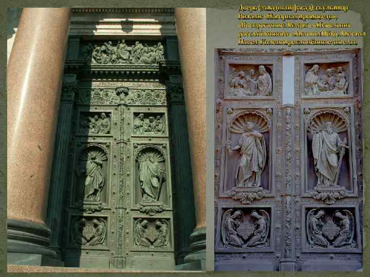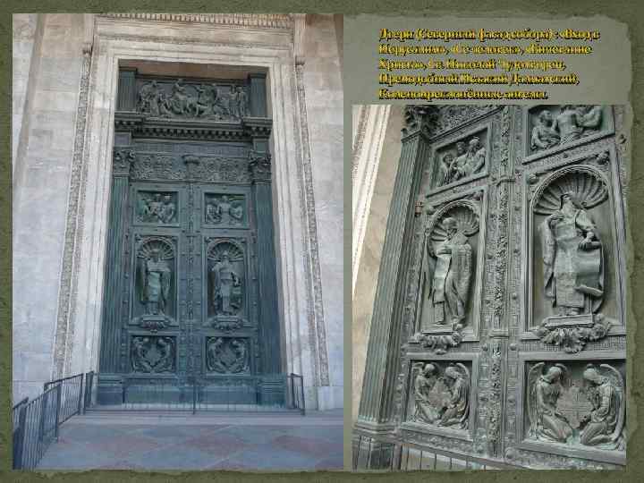 Двери (Северный фасад собора) : «Вход в Иерусалим» , «Се человек» , «Бичевание Христа» , Св. Николай Чудотворец, Преподобный Исаакий Далматский, Коленопреклонённые ангелы.