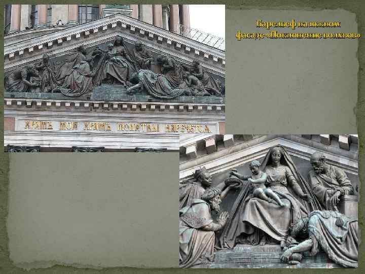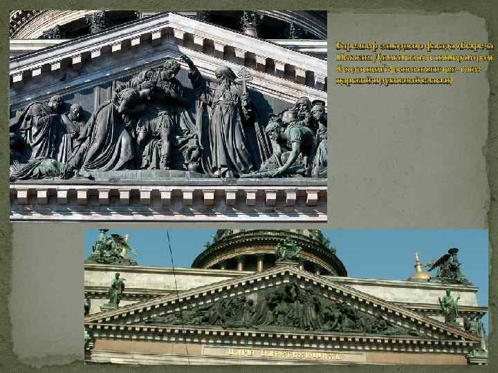 Барельеф западного фасада «Встреча Исаакия Далматского с императором Феодосием”» (основная идея - союз царской и духовной власти)