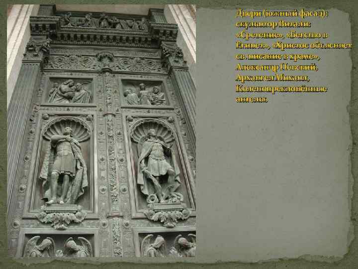 Двери (южный фасад): скульптор Витали: «Сретение» , «Бегство в Египет» , «Христос объясняет св. писание в храме» , Александр Невский, Архангел Михаил, Коленопреклонённые ангелы.