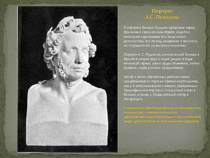 Портрет А. С. Пушкина В портрете Витали Пушкин предстает перед зрителем в героическом образе, подобно античным персонажам его лицо полно достоинства, его взгляд направлен в вечность, он сосредоточен на высоких помыслах. Портрет А. С. Пушкина, исполненный Витали в бронзе в начале 1840 -х годов, решен в виде античной гермы: шея и грудь обнажены, плечи срезаны, глаза условно прорисованы. Автор в своих портретных работах также придерживается строгих правил классицизма, как и в монументальных статуях, украшавших Триумфальные ворота и Опекунский совет в Москве, а затем и Исаакиевский собор в Петербурге. Главные его достоинства как классического скульптора - лаконизм силуэта уравновешенная композиция, они в полной мере присутствуют в пушкинском портрете.