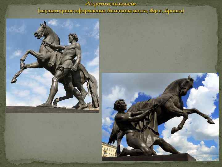 - - - выдающегося мастер-анималиста; сын генерала, участника Отечественной войны 1812 г. , родился в Петербурге; с 1828 г. Клодт начинает посещать Академию художеств в качестве вольнослушателя; Первой ответственной работой явилось исполнение в 1833 г. колоссальных моделей коней для скульптурной группы, венчающей Нарвские триумфальные ворота, сооруженные В. П. Стасовым; В 1833 г. скульптор приступил к работе над моделями первых двух групп «Укротителей коней» (из числа четырех), установленных на Аничковом мосту. В этих прославленных группах скульптор последовательно изобразил различные моменты укрощения необъезженного коня. Общая тема этих групп может быть определена как борьба воли и разума человека со стихийными силами природы. Поверженный наземь при первой попытке обуздать животное, человек в конечном счете все же становится победителем. В последней по замыслу группе он уверенно выступает рядом с подчинившимся ему конем; В группах Клодта мы видим сочетание точности в передаче натуры с известной обобщенностью пластической формы, реалистической конкретности с элементами декоративности. Четко переданные упругие объемы характерны для всех четырех групп и хорошо воспринимаются зрителями. Не менее ясными и художественно выразительными оказываются и их отчетливо рисующиеся силуэты. Соединение всех этих качеств делает группы Клодта превосходными образцами монументально-декоративной скульптуры, органически, активно включающимися в архитектурное окружение, в городской ансамбль. П. К. Клодт (1805 -1867 гг. )