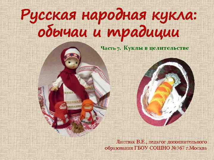 Русская народная кукла: обычаи и традиции Часть 7. Куклы в целительстве Листвак В. Е. , педагог дополнительного образования ГБОУ СОШНО № 367 г. Москва