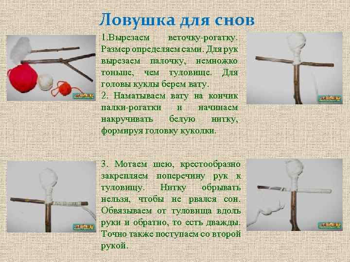 Ловушка для снов 1. Вырезаем веточку-рогатку. Размер определяем сами. Для рук вырезаем палочку, немножко тоньше, чем туловище. Для головы куклы берем вату. 2. Наматываем вату на кончик палки-рогатки и начинаем накручивать белую нитку, формируя головку куколки. 3. Мотаем шею, крестообразно закрепляем поперечину рук к туловищу. Нитку обрывать нельзя, чтобы не рвался сон. Обвязываем от туловища вдоль руки и обратно, то есть дважды. Точно также поступаем со второй рукой.