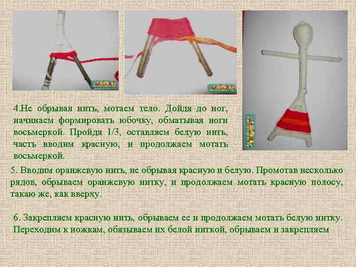 4. Не обрывая нить, мотаем тело. Дойдя до ног, начинаем формировать юбочку, обматывая ноги восьмеркой. Пройдя 1/3, оставляем белую нить, часть вводим красную, и продолжаем мотать восьмеркой. 5. Вводим оранжевую нить, не обрывая красную и белую. Промотав несколько рядов, обрываем оранжевую нитку, и продолжаем мотать красную полосу, такаю же, как вверху. 6. Закрепляем красную нить, обрываем ее и продолжаем мотать белую нитку. Переходим к ножкам, обязываем их белой ниткой, обрываем и закрепляем.