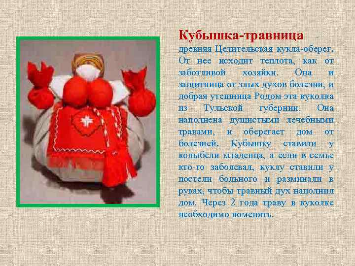 Кубышка-травница - древняя Целительская кукла-оберег. От нее исходит теплота, как от заботливой хозяйки. Она и защитница от злых духов болезни, и добрая утешница Родом эта куколка из Тульской губернии. Она наполнена душистыми лечебными травами, и оберегает дом от болезней. Кубышку ставили у колыбели младенца, а если в семье кто-то заболевал, куклу ставили у постели больного и разминали в руках, чтобы травный дух наполнил дом. Через 2 года траву в куколке необходимо поменять.