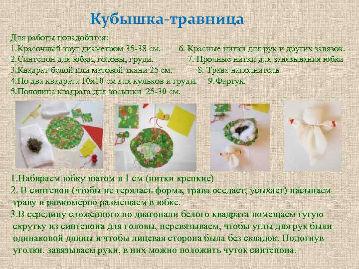 Кубышка-травница Для работы понадобится: 1. Красочный круг диаметром 35 -38 см. 6. Красные нитки для рук и других завязок. 2. Синтепон для юбки, головы, груди. 7. Прочные нитки для завязывания юбки 3. Квадрат белой или матовой ткани 25 см. 8. Трава наполнитель 4. По два квадрата 10 х10 см для кульков и груди. 9. Фартук. 5. Половина квадрата для косынки 25 -30 см. 1. Набираем юбку шагом в 1 см (нитки крепкие) 2. В синтепон (чтобы не терялась форма, трава оседает, усыхает) насыпаем траву и равномерно размещаем в юбке. 3. В середину сложенного по диагонали белого квадрата помещаем тугую скрутку из синтепона для головы, перевязываем, чтобы углы для рук были одинаковой длины и чтобы лицевая сторона была без складок. Подогнув уголки. завязываем руки, в них можно положить чуток синтепона.
