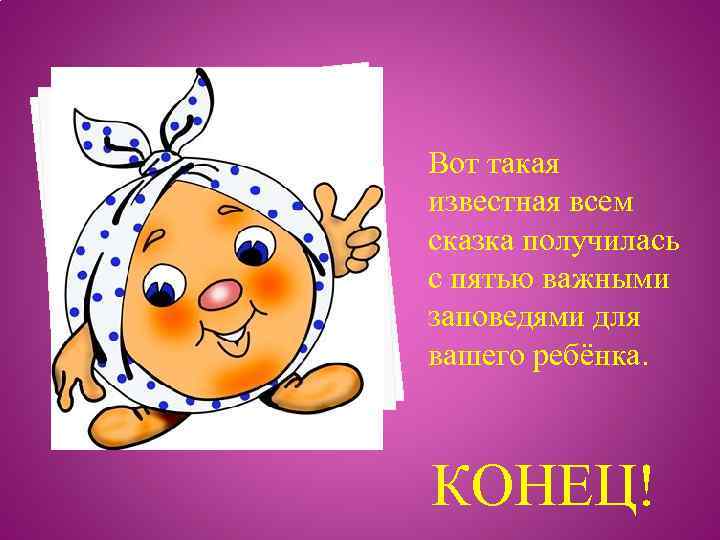 Вот такая известная всем сказка получилась с пятью важными заповедями для вашего ребёнка. КОНЕЦ!